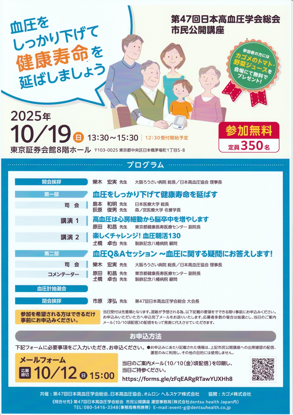 応募方法 :メールフォーム(第47回日本高血圧学会総会 市民公開講座 申し込みフォーム)からのお申し込み